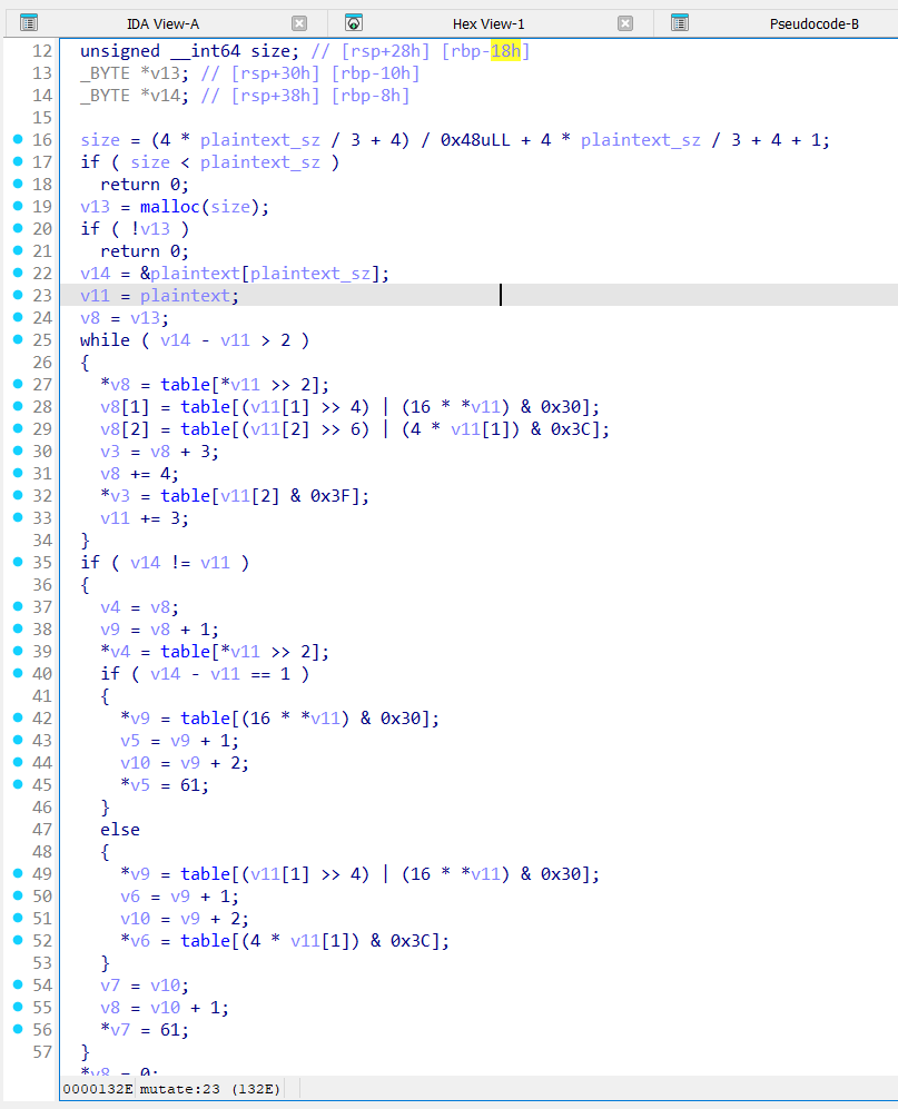 The mutation algorithm looks really similar to the base64 algorithm. I asked DeepSeek what was going on here, and it confirmed my suspicions by telling me that this was base64 but with a different table!