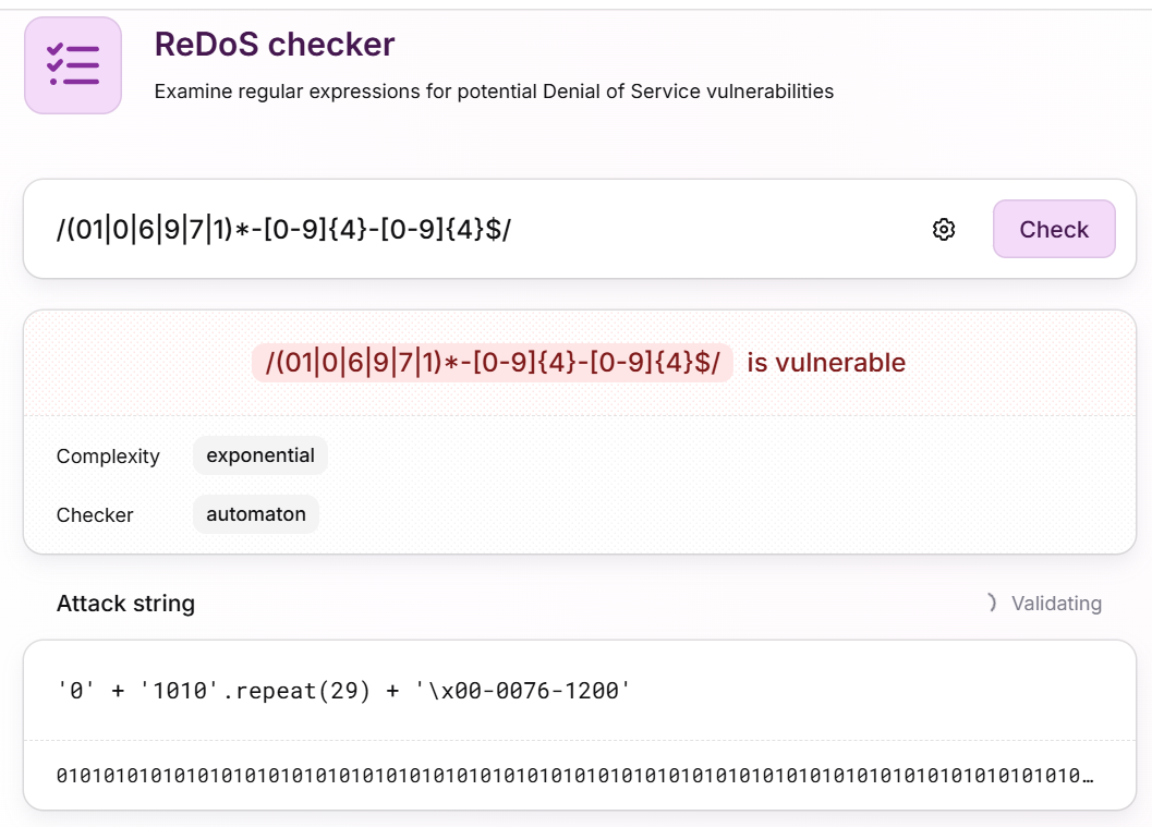 I found this ReDoS checker (which conveniently gives you a ReDoS payload to use) here: https://devina.io/redos-checker