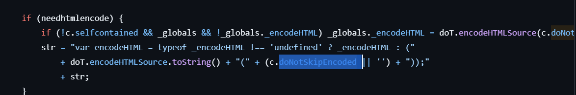 NO!!! I spent the next hour foolishly prompting DeepSeek to give me a payload that would lead to RCE on dot. DeepSeek kept hallucinating up payloads that didn’t actually work, so I decided to look at the dot source code myself: https://github.com/olado/doT/blob/master/doT.js